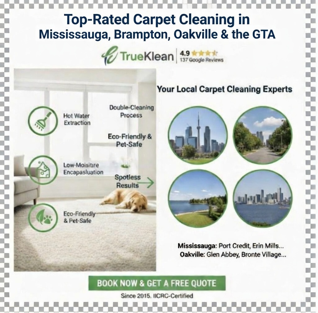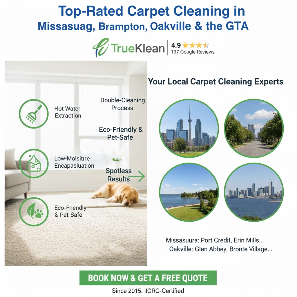 Welcome to TrueKlean, the top-rated carpet cleaning service in Mississauga, Brampton, Oakville, and the Greater Toronto Area (GTA). With a proven double-cleaning process combining low-moisture encapsulation and hot water extraction (steam cleaning), we deliver spotless results for homes and businesses. Our IICRC-certified team uses eco-friendly, pet-safe solutions to remove deep dirt, stains, allergens, and odors—leaving your floors fresh and revitalized.